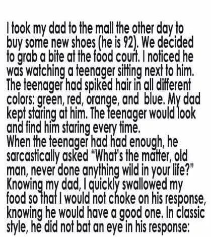Last weekend, I took my 92-year-old dad to the mall to buy him a new pair of shoes. After wandering through store aisles and finally finding the right pair, we decided to rest and have a meal at the food court. We chose a table beside a teenager with bold, brightly spiked hair—a striking mix of green, red, orange, and blue. My dad noticed him immediately, not with disapproval, but with the quiet curiosity of someone who has seen nearly a century of changing styles and self-expression.