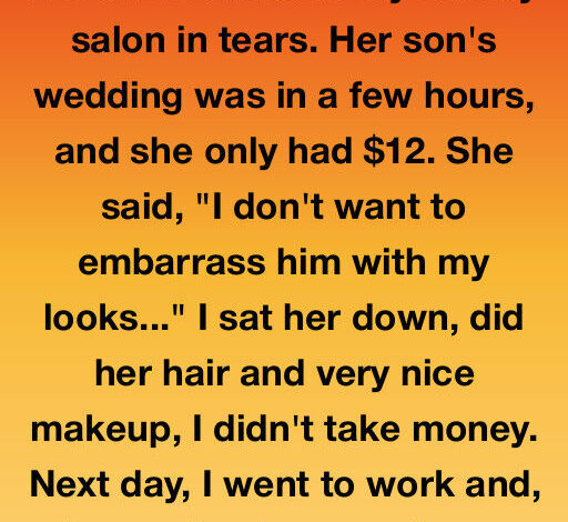 “My son’s wedding is in a few hours,” she whispered. “I don’t want to embarrass him. I have twelve dollars.”
