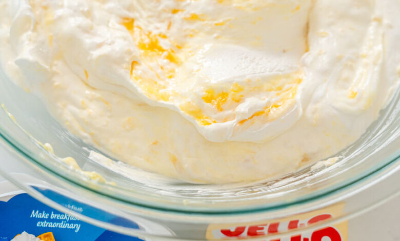 - Preheat & Prepare Cake: Preheat your oven to 350°F (175°C) and grease a 9×13-inch baking dish. In a mixing bowl, beat the 1 box yellow cake mix, 3 eggs, ⅓ cup oil, and 1 cup water until well combined. Add one of the (11 oz) cans of drained mandarin oranges to the batter and beat until the oranges are well blended in. Pour the batter into the prepared baking dish.