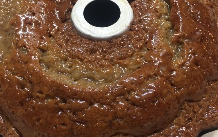 - Once the cake is done baking, remove it from the oven and immediately pour the buttery glaze over the hot cake.
