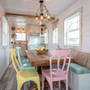 The dining area is a whimsical blend of antique charm and modern functionality. An antique wooden table serves as the centerpiece, surrounded by mismatched pastel chairs that add a playful touch to the space. Overhead, a wrought-iron chandelier provides ambient lighting, casting a warm glow over the dining area. This space is designed to be both functional and aesthetically pleasing, offering a delightful setting for meals and gatherings.