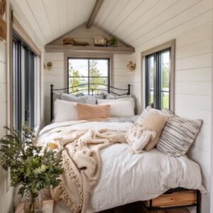 The bedroom is a serene sanctuary, designed to be a peaceful retreat from the outside world. High ceilings and shiplap walls in whites and creams create an airy and tranquil atmosphere. A wrought-iron bed serves as the focal point, enhanced by soft textiles and muted colors that promote relaxation. This space is thoughtfully designed to maximize comfort and style, offering a restful haven within the tiny house.