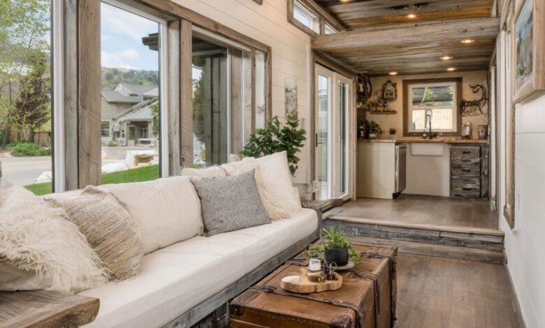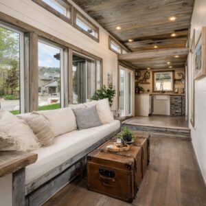 Inside, the living area of this tiny house is a cozy sanctuary that marries modern design with rustic elements. Distressed wooden floors and shiplap walls in neutral tones set a warm and inviting backdrop for the plush furnishings. A cozy sofa provides a comfortable spot to relax, while a vintage trunk serves as a charming coffee table, adding a touch of nostalgia to the space. The large windows not only offer stunning views but also ensure the living area is bathed in natural light, enhancing the warm and welcoming atmosphere.