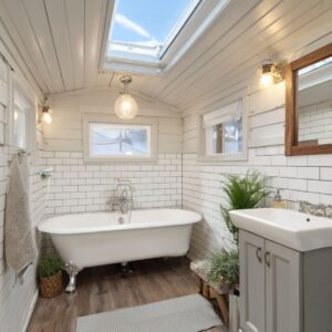 The bathroom combines modern comforts with vintage appeal, creating a space that is both functional and stylish. A clawfoot tub sits under a skylight, offering a luxurious spot for relaxation while allowing natural light to illuminate the space. Subway tiles line the walls, providing a clean and classic look, while a pedestal sink adds to the vintage charm. This bathroom is designed to be a practical yet elegant space, offering all the amenities needed for daily living.