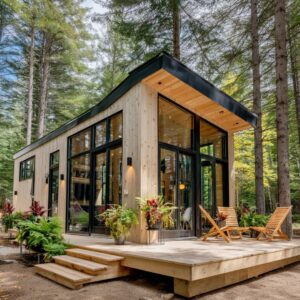 The exterior of this eco-friendly tiny house is a testament to contemporary minimalist design, seamlessly integrated into its natural surroundings. The structure is clad in light wood vertical siding, which contrasts beautifully with the sleek black metal roofing and window frames. Large floor-to-ceiling windows and glass doors dominate the front facade, inviting natural light to flood the interior while offering breathtaking views of the forest. A spacious wooden deck extends from the house, furnished with teak folding chairs and adorned with vibrant potted plants, creating an inviting outdoor living space that blends effortlessly with the towering evergreen trees that form a natural canopy overhead.