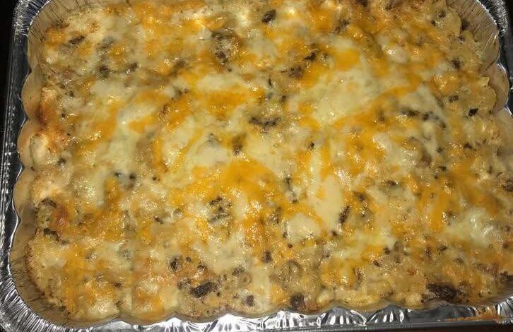 3. Repeat layers: Layer the remaining half of the meat and mushroom mixture over the macaroni, and then top with the remaining half of the uncooked macaroni.