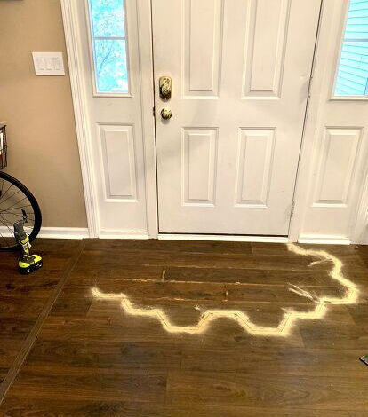 See that word “rug” in my title? Remember what our cat does to them? Here’s yet another house project that had to be completed due to Lucky having no respect for floor coverings. And I thought I was safe this time, people! We had a big entry mat that was rubbery and patterned with gaps and swirls, so there was no way that thing should’ve been inviting to pee on! But our cranky old man found a way to balance precariously and do his business anyway, ruining the laminate flooring underneath a little more every time.