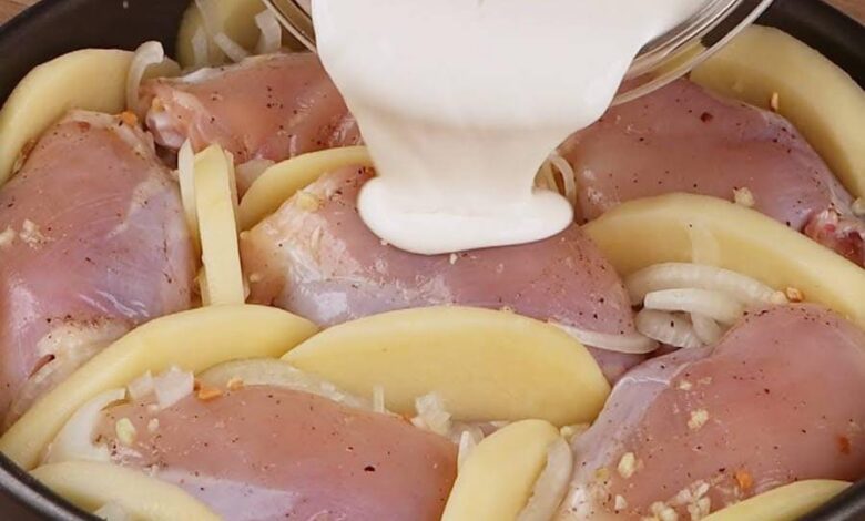 Juicy Baked Chicken Thighs with creamy Mozzarella and Potatoes