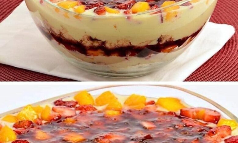 2. Repeat the Layers: Make another layer of ladyfingers, followed by the remaining milk mixture, fruit, and finally, the rest of the gelatin.