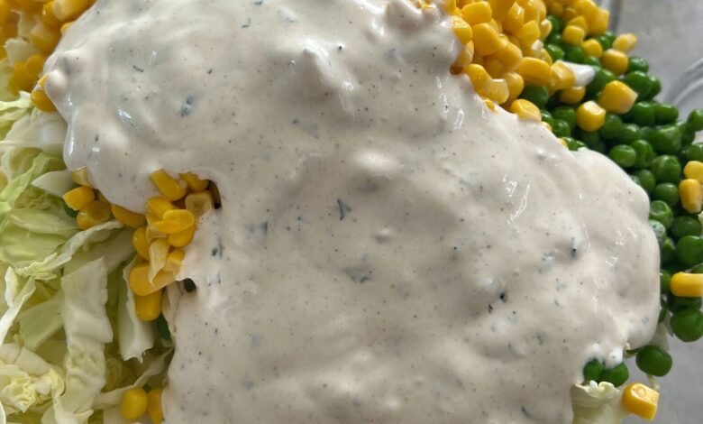 - Toss & Chill: Toss all the ingredients gently until the cabbage, corn, and peas are thoroughly coated with the creamy dressing.