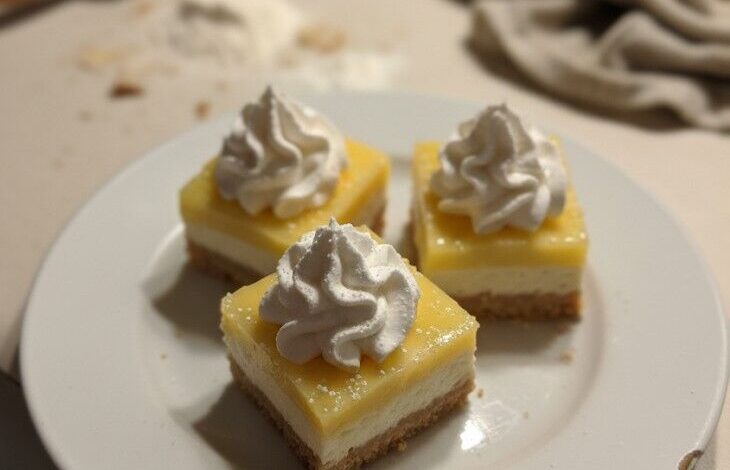 Bright, tangy, and irresistibly smooth—these layered bars are a sunshine-filled treat with a graham cracker crust and a luscious lemon finish.