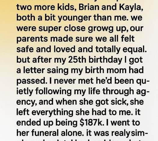 Then came my 25th birthday. A letter arrived from a lawyer: my birth mother, Alina, had passed away and left me her entire estate—$187,000. I was flooded with emotion. I thought my family would stand beside me.