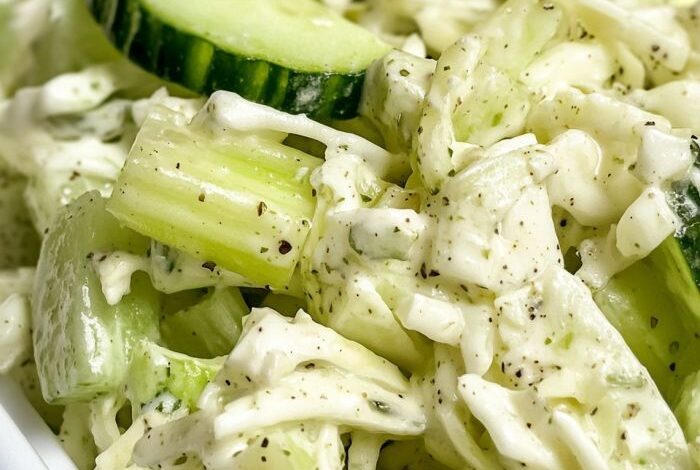 This Creamy Peppery Coleslaw is a refreshing twist on a classic picnic favorite. With the added crunch of fresh cucumbers and celery, this coleslaw has a bright and vibrant texture. The creamy, zesty dressing, with its hint of black pepper and Dijon mustard, perfectly complements the crisp vegetables, making it an excellent side dish for grilled meats, sandwiches, or barbecues.