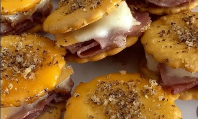 1. Step 1: Assemble the Sandwiches: Preheat your oven to 350°F (175°C). On 24 Ritz crackers, layer a slice of deli ham and Swiss cheese. Top each with another Ritz cracker, creating 24 sandwich pairs.