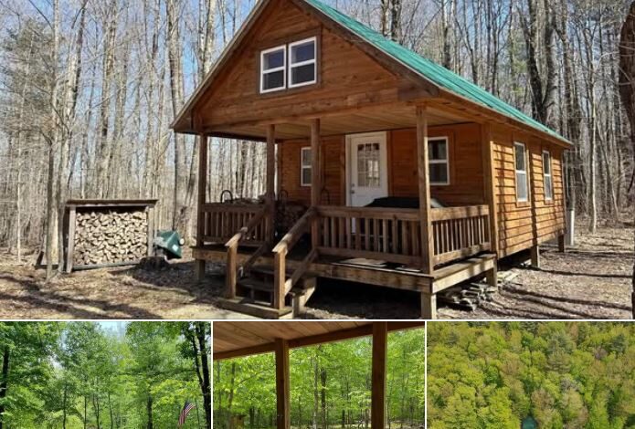 The one-room layout is simple and functional, featuring space for sleeping, dining, and relaxing. A wood-burning stove keeps the space cozy, and a loft adds extra room for storage or additional sleeping space. While there’s no running water or indoor bathroom, an outhouse is available, and power can be supplied via a generator.