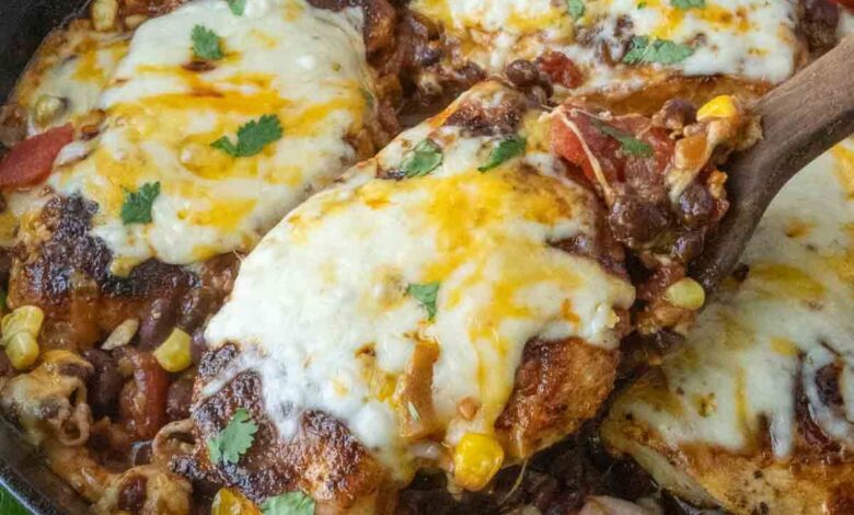 This Santa Fe Chicken dish brings vibrant Southwest flavors to your table in a simple one-pan meal. Tender, spiced chicken breasts are nestled in a hearty mix of black beans, corn, tomatoes, and green chiles, all topped with melted Colby Jack cheese and a bright squeeze of lime.