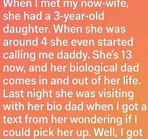 She was three when I met her—curls, cautious eyes, and a stuffed giraffe clutched like armor. By four, she started calling me “Daddy” on her own, like it had always been my name. She’s thirteen now. Her biological father drifts in and out like bad weather. Last night, she was with him when my phone lit up:
