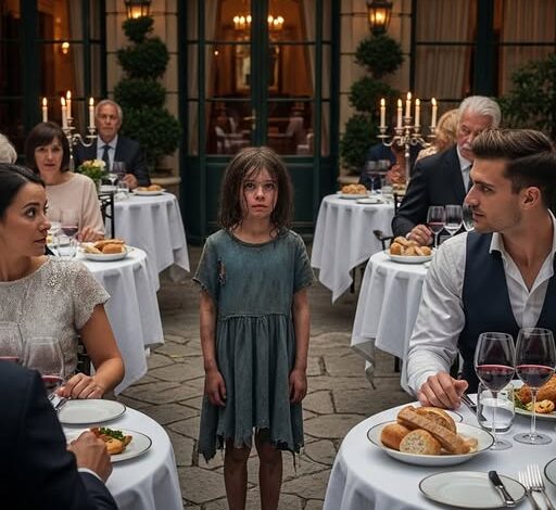 A man in a tailored navy suit, about to enjoy the first bite of a dry-aged ribeye, froze. Slowly, he turned toward the source: a small girl, messy hair, dirty sneakers, and eyes that carried both hope and hunger. No one in the room could’ve predicted that such a simple question would transform both of their lives forever.