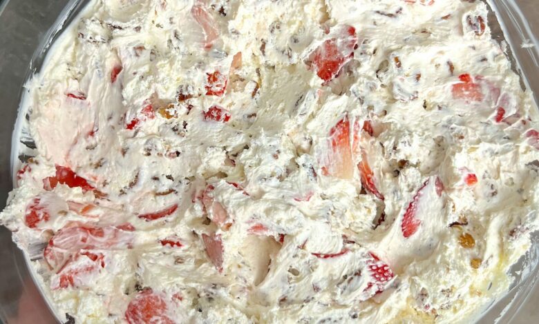 - Assemble and Serve: For serving: Just before serving, take out your chilled cream mixture. Top it with the 4 cups sliced strawberries and the cooled pretzel crunch pieces. Gently mix the strawberries and pretzel crunch into the cream mixture right before serving to maintain the texture of the crackle. You can also top with a bit more pretzel crunch if desired for extra visual appeal and texture.
