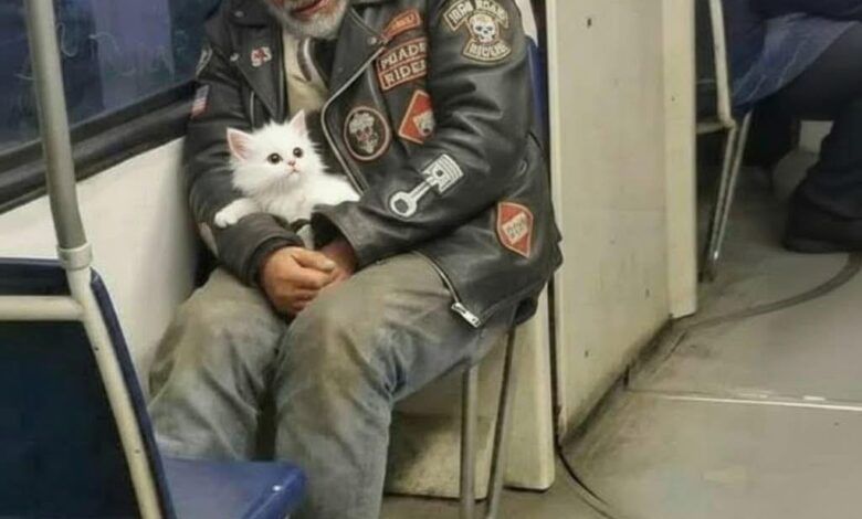 Nobody said anything at first. The train rattled on through the tunnel. The biker wiped his eyes with the back of one hand, still cradling the kitten with the other. It had its tiny paws pressed against his chest, kneading his shirt, completely content.