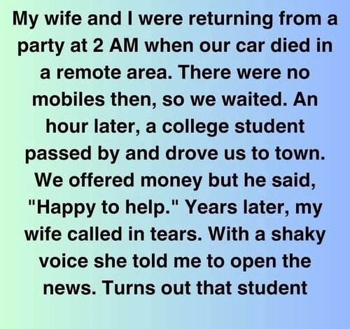 My wife and I were returning from a party at 2 AM when our car died in a remote area. There were no mobiles then, so we waited. An hour later, a college student passed by and drove us to town. We offered money but he said, “Happy to help.” Years later, my wife called in tears. With a shaky voice she told me to open the news. Turns out that student…
