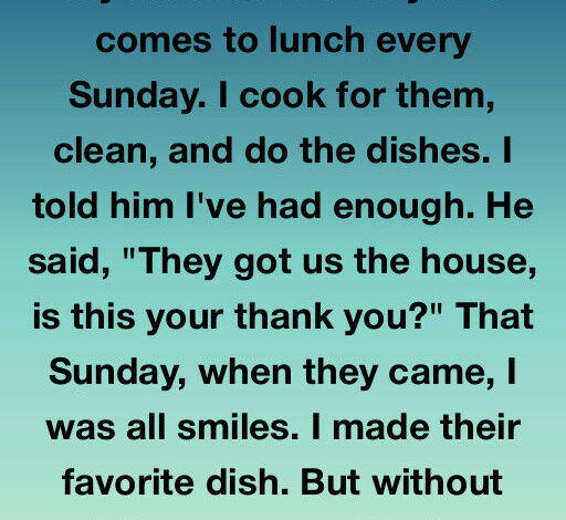 For three years, every Sunday at noon, our house became the family’s gathering place. Without fail, eight people would stream through the door—my husband’s parents, his siblings, their children—hungry, loud, and expectant. It was tradition. I chopped, sautéed, plated, and cleaned while laughter echoed from the living room. I was the hostess, the cook, the dishwasher—and somehow, invisible.