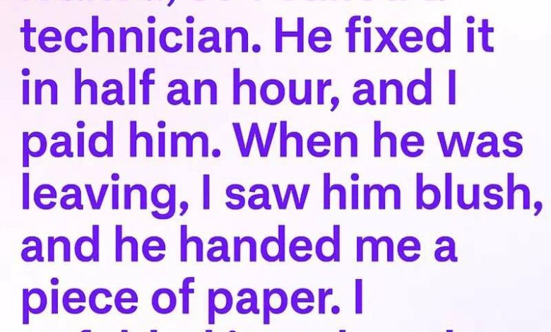 It all started with a simple, everyday problem: the washing machine was leaking. I quickly called a professional repairman to take a look. He arrived, worked his magic, and fixed the leak in less than an hour. I paid him for the service, and he was on his way out the door. That’s when things took an unexpected turn.As the young man was leaving, I noticed his cheeks turned pink, and he nervously reached out to hand me a small piece of paper. I took the note, unfolded it, and read the strange message: “Please call me. It’s about someone you know.”