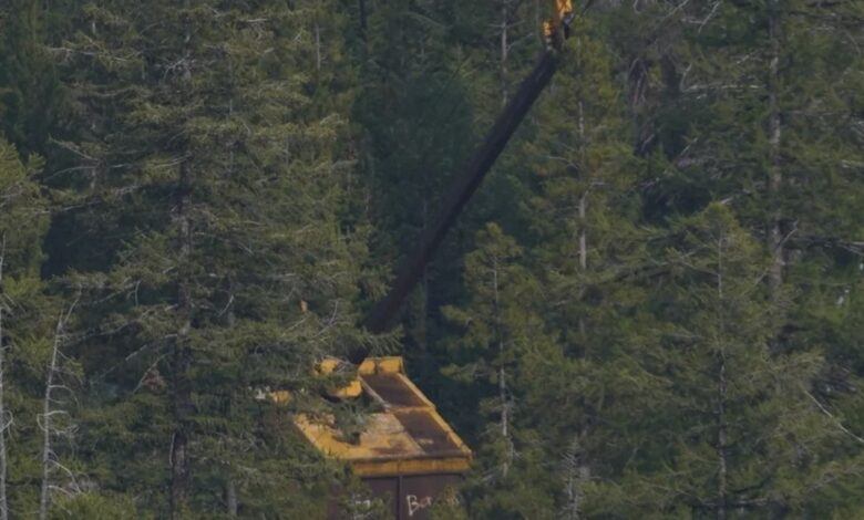 Roughly five miles into the wilderness trail, you come upon an odd thing to behold. In the depths of the forest, towering pines and silence surround a literal and figurative giant—a huge yellow cable logging machine frozen in time.