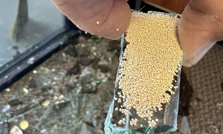 If you ever see tiny beads alongside broken glass, you are probably looking at the desiccant of a broken dual-pane window.