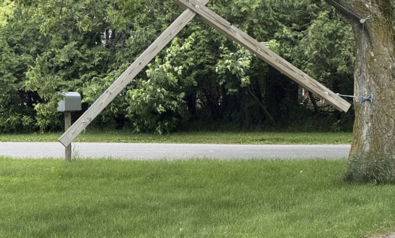 It’s a do-it-yourself frame that allows you to hang a hammock from a single tree. Two long boards intersect in a letter X, anchored and braced so it won’t tip over or snap under the weight. Functional. Weirdly elegant.